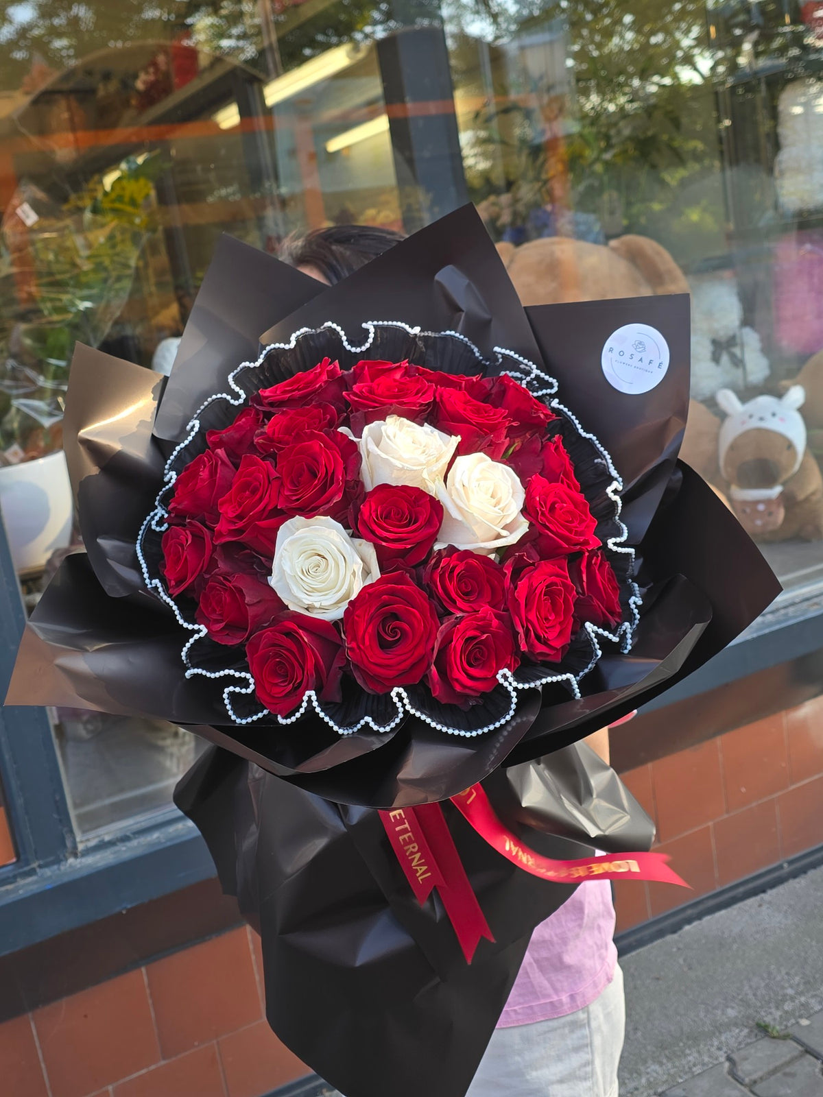 Each rose is carefully selected and arranged in black wrapping paper with delicate lace decoration and a ribbon with the inscription "Love is Eternal". The bouquet has a luxurious and modern feel, ideal for an anniversary, engagement, wedding gift or simply to express deep affection.