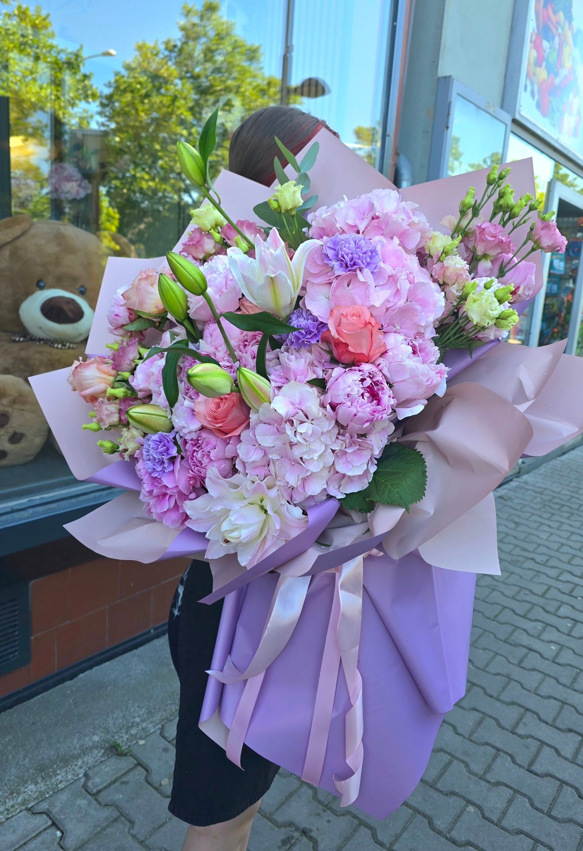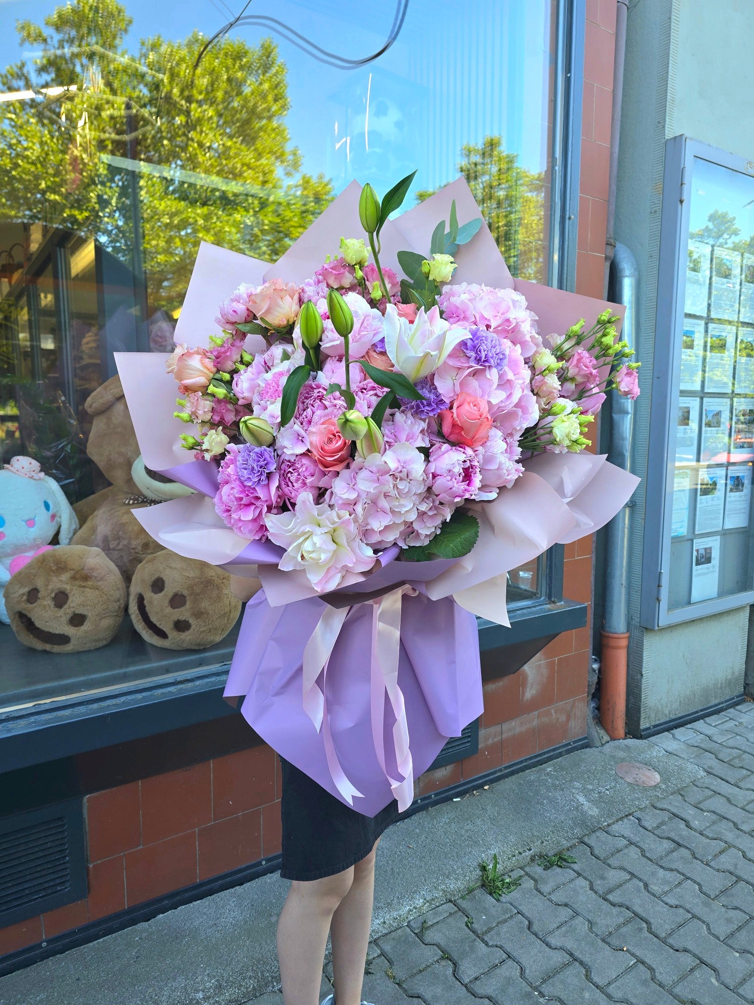 Enter a world of elegance and delicacy with this luxurious bouquet in shades of pink, purple and cream. Dominant peonies and hydrangeas complemented by fresh lilies and roses create an exceptional composition that is guaranteed to leave an impression.