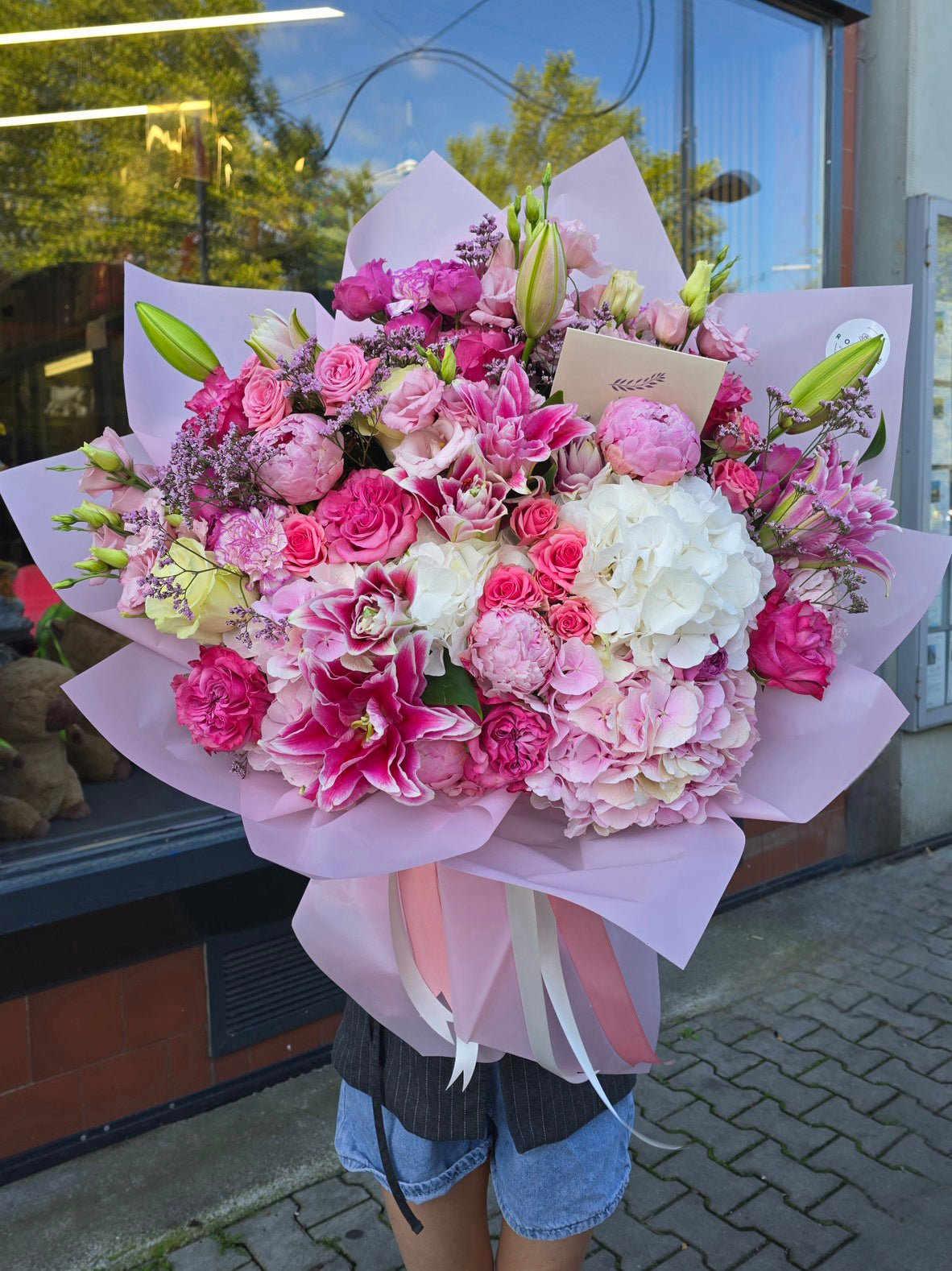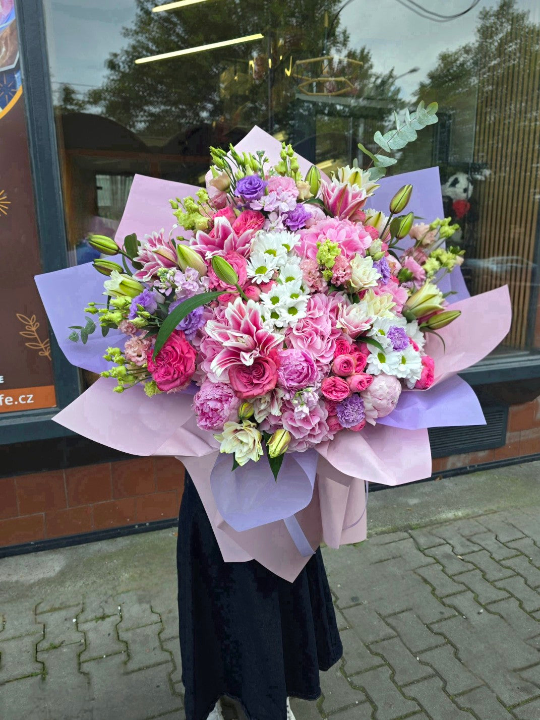 Tato luxusní XXL kytice je impozantní květinové aranžmá, které na první pohled zaujme svou velikostí, bohatostí i jemnou barevnou harmonií. Kombinace růží, lilií, chryzantém, karafiátů a dalších sezónních květin v růžovo-fialových a bílých odstínech působí romanticky, elegantně a velmi reprezentativně.
