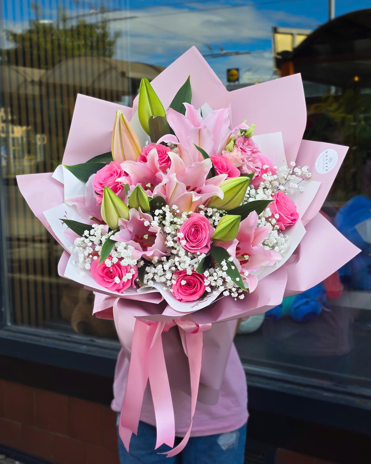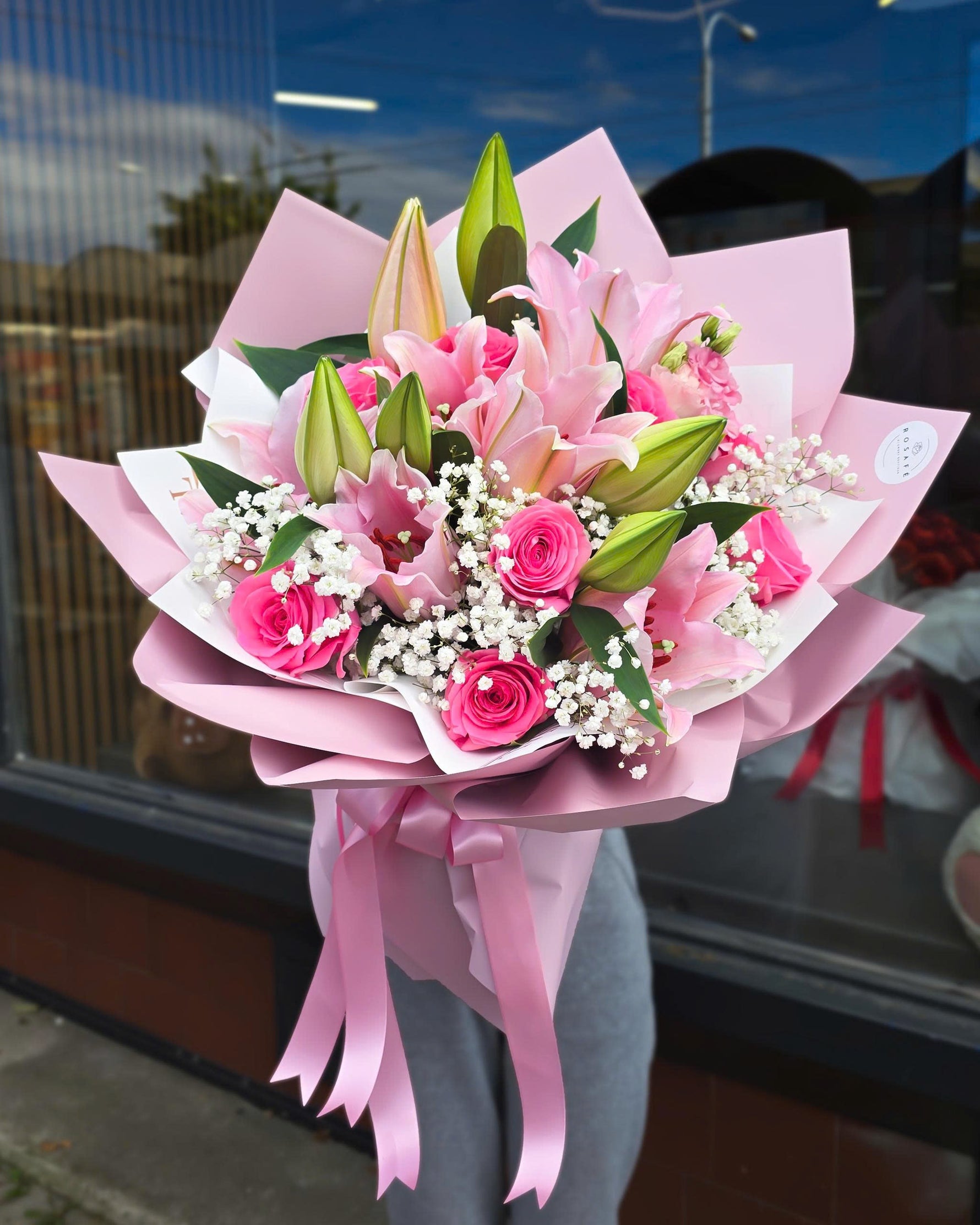 Elegantní kytice v jemných růžových tónech, kombinující voňavé růžové lilie, růže a bílé gypsophily. Vhodná jako dárek k narozeninám, výročí, poděkování nebo jen tak pro radost.