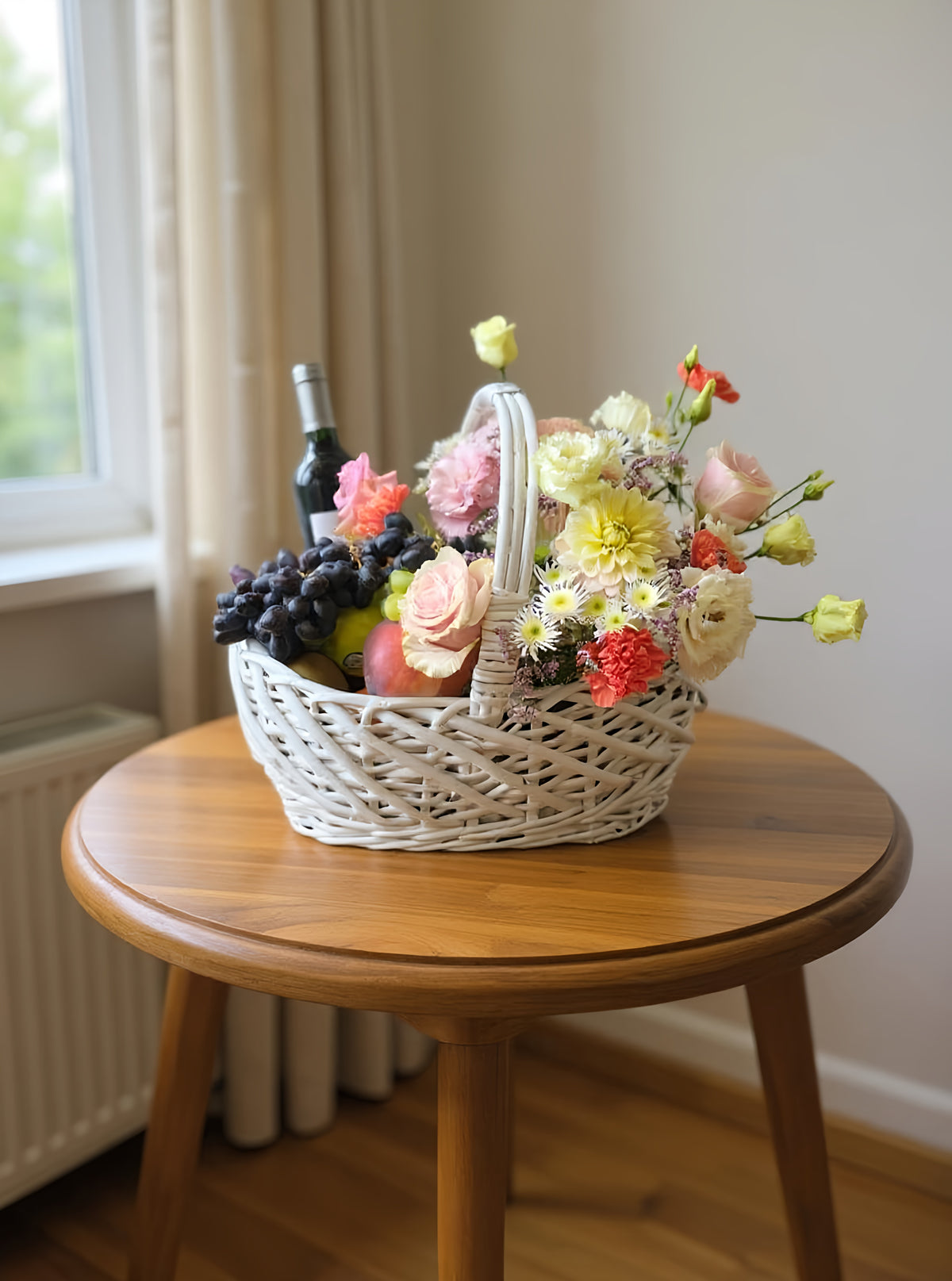 Подарунковий кошик з квітами, фруктами та вином - елегантний подарунок