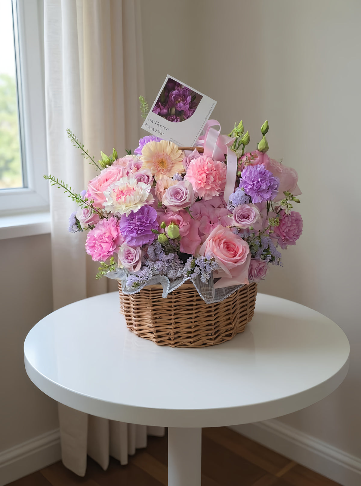 Порадуйте своїх близьких цим чудовим квітковим кошиком, сповненим романтики. Композиція містить свіжі троянди, гвоздики, еустоми, гербери та додаткові квіти в ніжних тонах рожевого, фіолетового та білого. Все ретельно розміщено в елегантному плетеному кошику та доповнено атласною стрічкою та листівкою з привітанням.