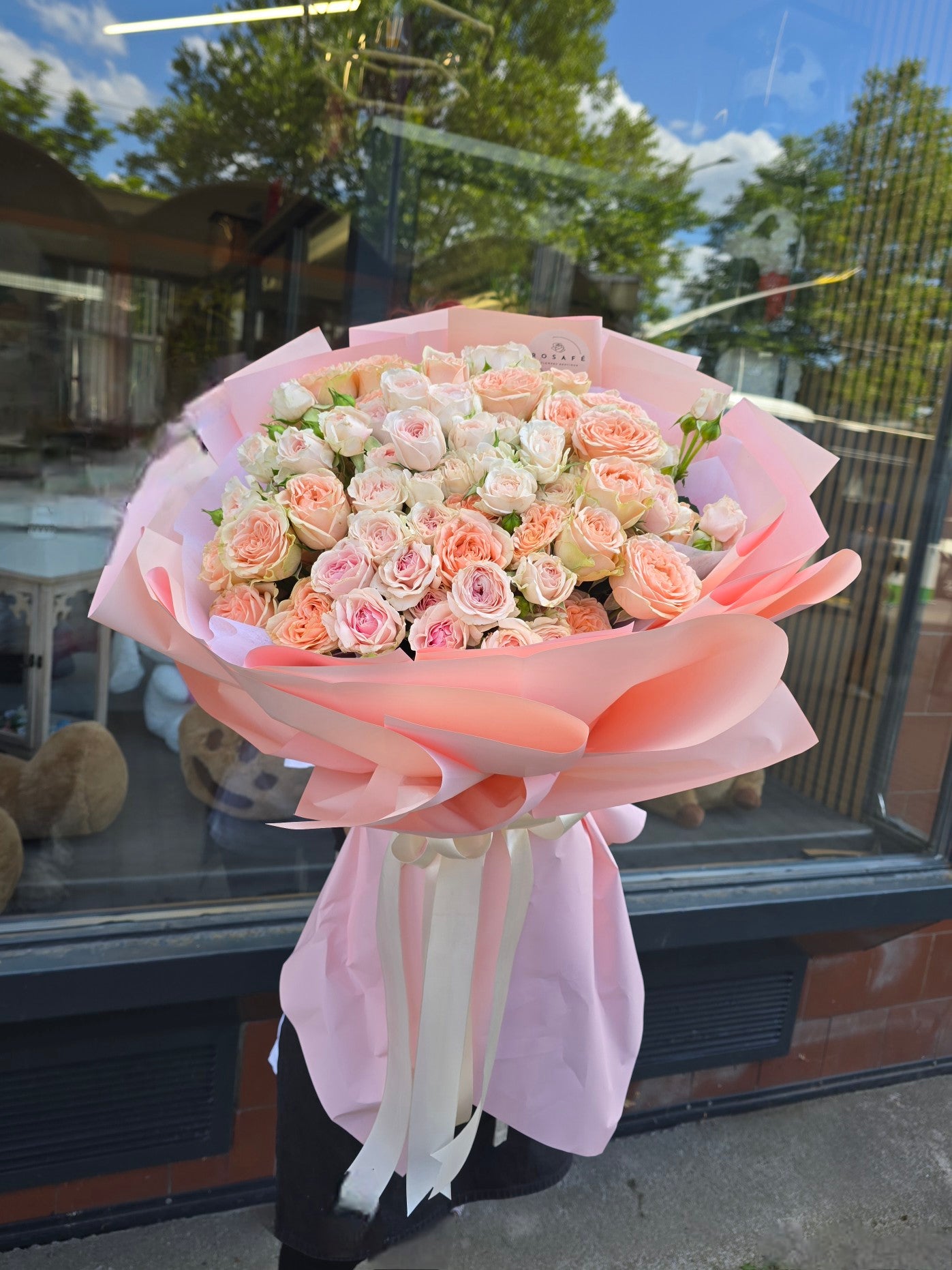 Розкішний букет гроноподібних троянд – рожевих та кремових