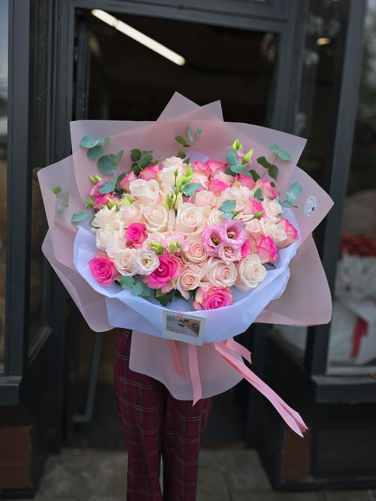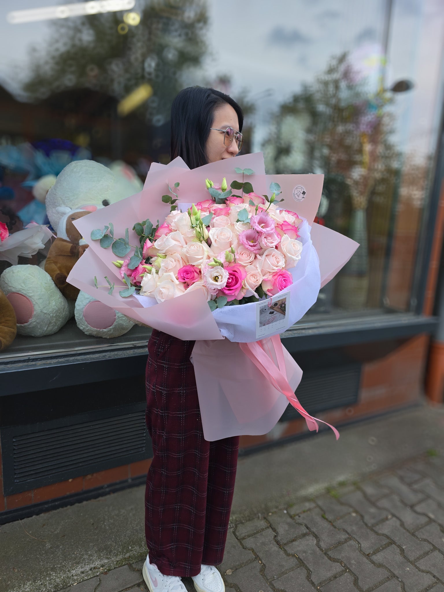 Цей чарівний букет поєднує 45 троянд у ніжних відтінках рожевого та кремового, доповнених 4 квітками еустоми та евкаліптом для свіжого зеленого відтінку. Елегантно загорнутий у рожевий папір та перев'язаний бантом, він стане ідеальним подарунком для святкування кохання, дружби чи особливих моментів.